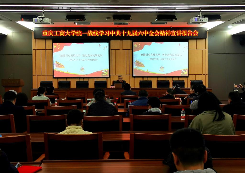 根据学校党委印发的《122cc太阳集成游戏关于学习宣传贯彻党的十九届六中全会精神深化拓展党史学习教育的工作方案》的安排,结合学校统一战线开展“学党史、讲《条例》、增合力、促发展”大走访大谈心活动,2021年12月8日下午,学校党委统战部在新图书馆会议中心一会议室举办统一战线学习中共十九届六中全会精神宣讲报告会,各民主党派基层组织和统战团体班子成员及统战成员代表共计50余人参会。