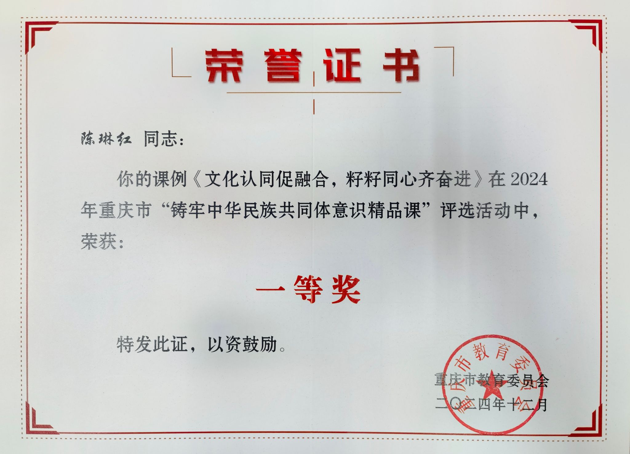 喜讯:我校教师陈琳红在2024年重庆市“铸牢中华民族共同体意识精品课”评选活动中获奖
