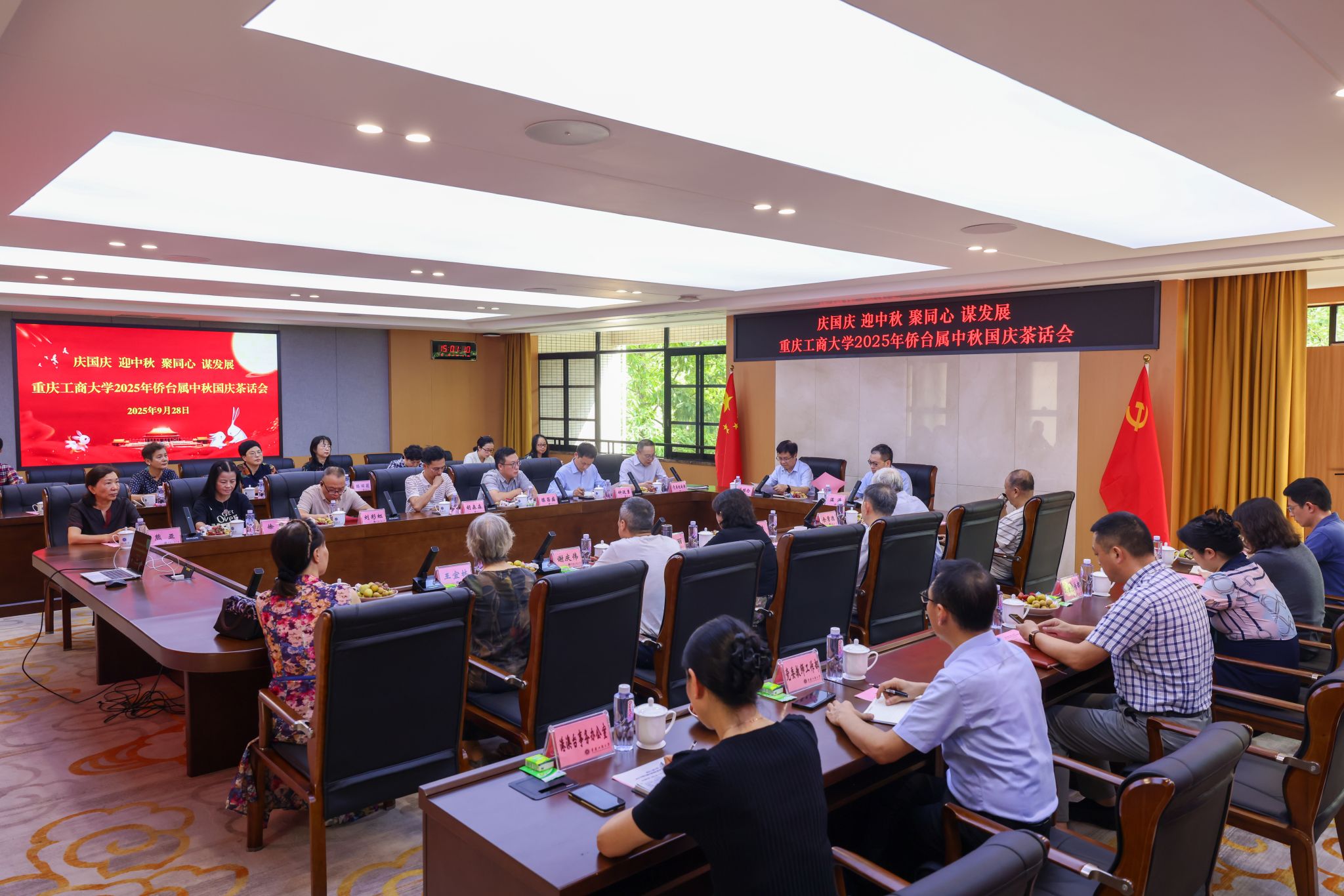 9月28日下午,我校在厚德楼3019会议室召开“ 迎中秋 庆国庆 聚同心 谋发展——122cc太阳集成游戏2025年侨台属中秋国庆茶话会”。校党委书记曾维伦,校长温涛;党政办公室、党委组织部、党委宣传部、党委统战部、党委离退休工作部、党委教师工作部、港澳台事务办公室等部门负责同志,以及20余名侨台属代表参加了会议。会议由校党委常委、统战部部长华杰主持。