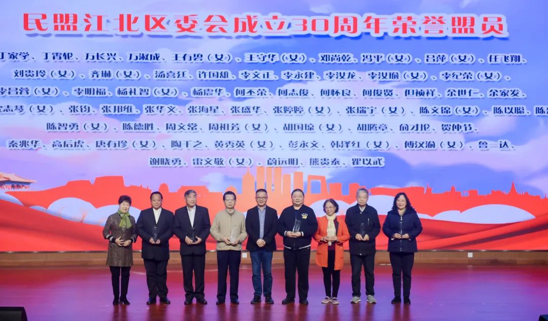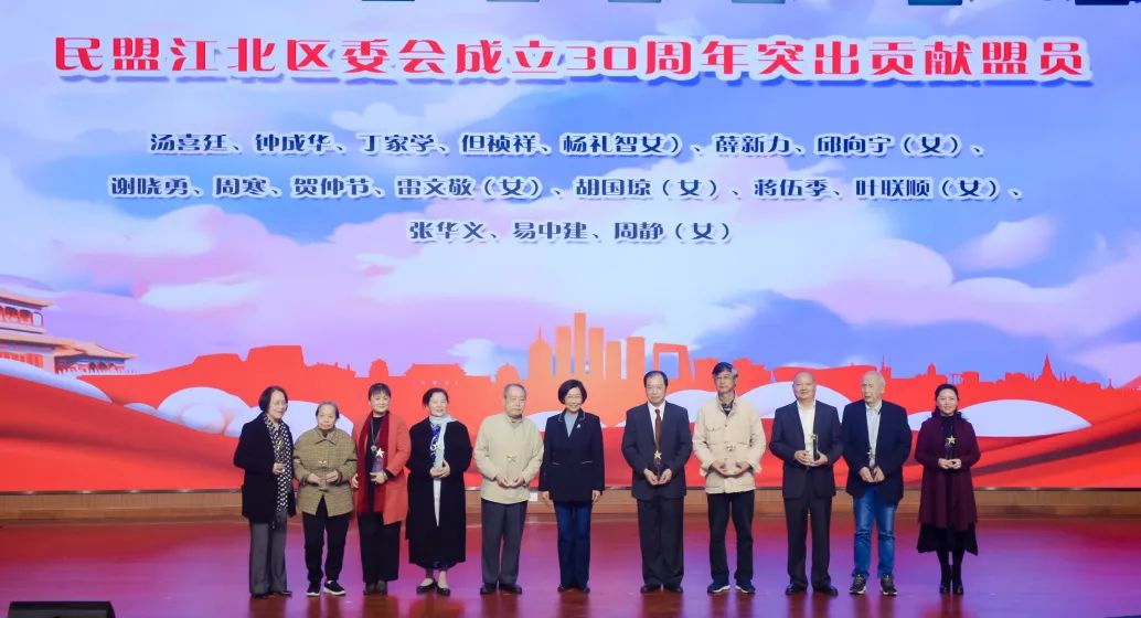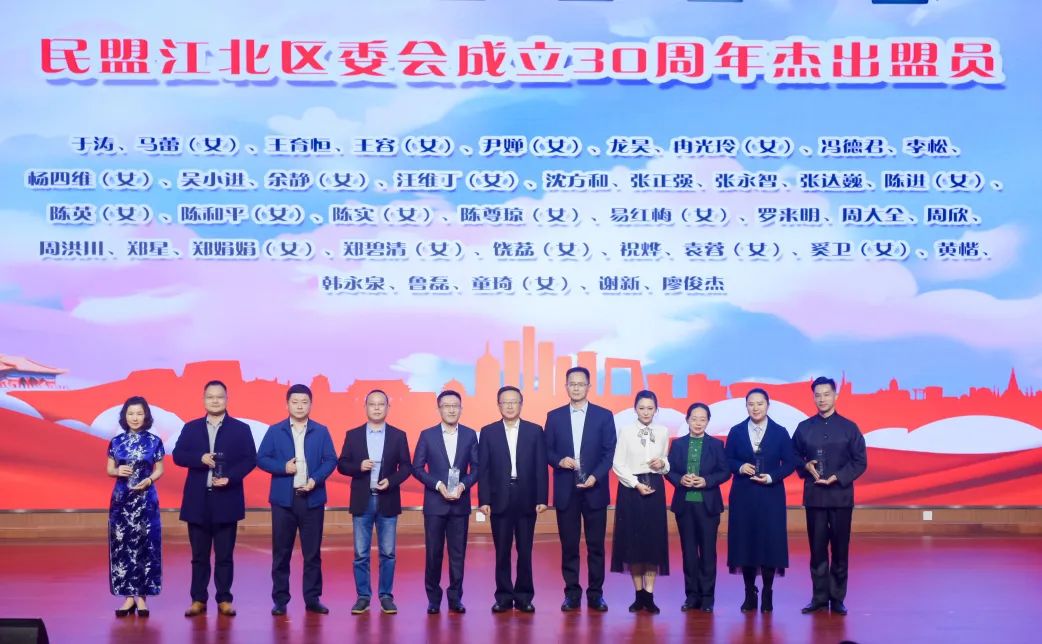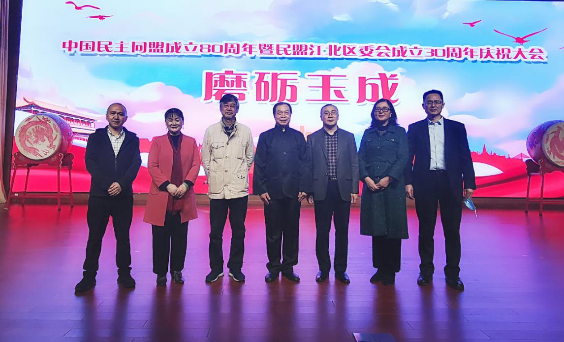 我校盟员谢新、汪维丁、张永智、饶荔获得民盟江北区委会成立30周年杰出盟员,谢新代表我校获奖盟员上台领奖(右五)