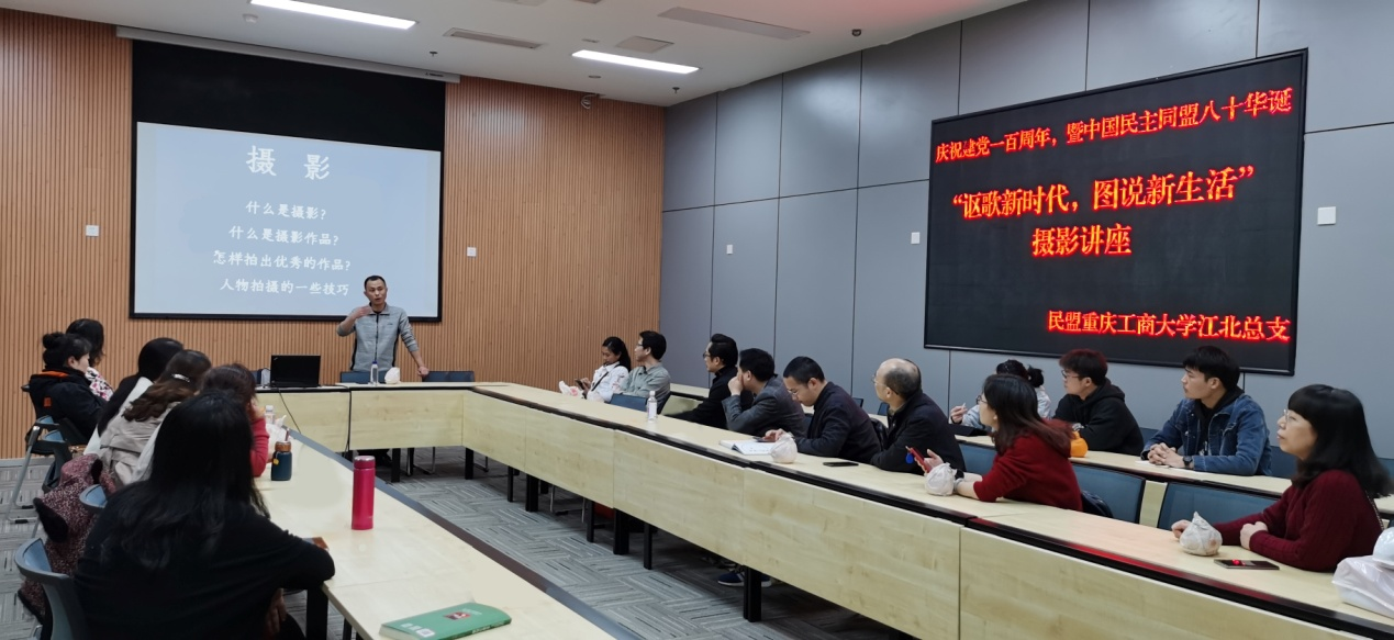 为庆祝中国共产党建党一百周年暨中国民主同盟成立八十华诞,民盟学校江北校区总支于2021年4月9日在图书馆会议中心第三会议室举办“讴歌新时代 图说新生活”摄影讲座。本次讲座由盟员程晓春主讲,教学支部和机关支部部分盟员参加了讲座。