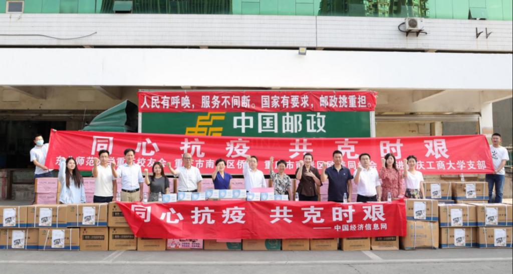 本次捐赠仪式在中邮物流重庆配送中心举行,出席本次捐赠仪式的有:南岸区侨联主席马红,秘书长谭欢,南岸区欧美同学会副主席李佳、122cc太阳集成游戏侨联主席王建明,民进122cc太阳集成游戏支部委员孟妍,东北师范大学重庆校友会会长林长春,东北师范大学重庆校友会秘书长、122cc太阳集成游戏侨联副主席钟廷勇,中国经济信息网重庆地区负责人刘海斌,东北师范大学校友、中国邮政重庆分公司副总张星东。
